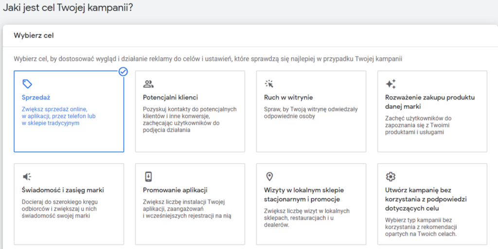 Teraz przeniesie nas do okna wyboru celu kampanii. Oczywiście najlepiej wybrać sprzedaż, żeby kampania optymalizowała się pod to wydarzenie.