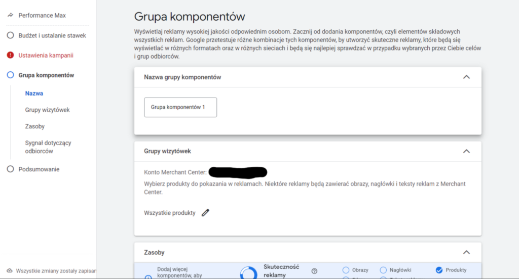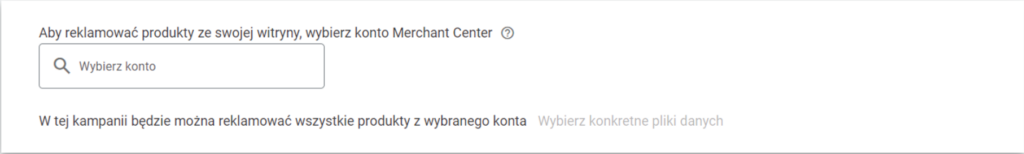 Nie zapomnij o wybraniu konta Merchant Center! Bez tej opcji nie będziesz w stanie reklamować swoich produktów w reklamach produktowych.