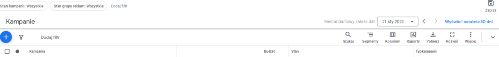 W tym celu wchodzimy w zakładkę kampanie i klikamy niebieski znaczek “+” by utworzyć nową kampanię