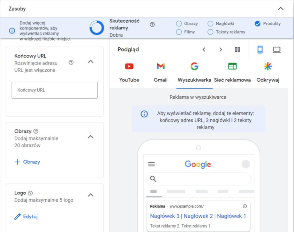 Dalej mamy “Zasoby”czyli nic innego, niż faktyczna reklama, którą zobaczą Twoi klienci. Po prawej możesz również zobaczyć na podglądzie to, jak reklama będzie wyglądała w poszczególnych miejscach i na różnych urządzeniach. Polecam to sprawdzić.
