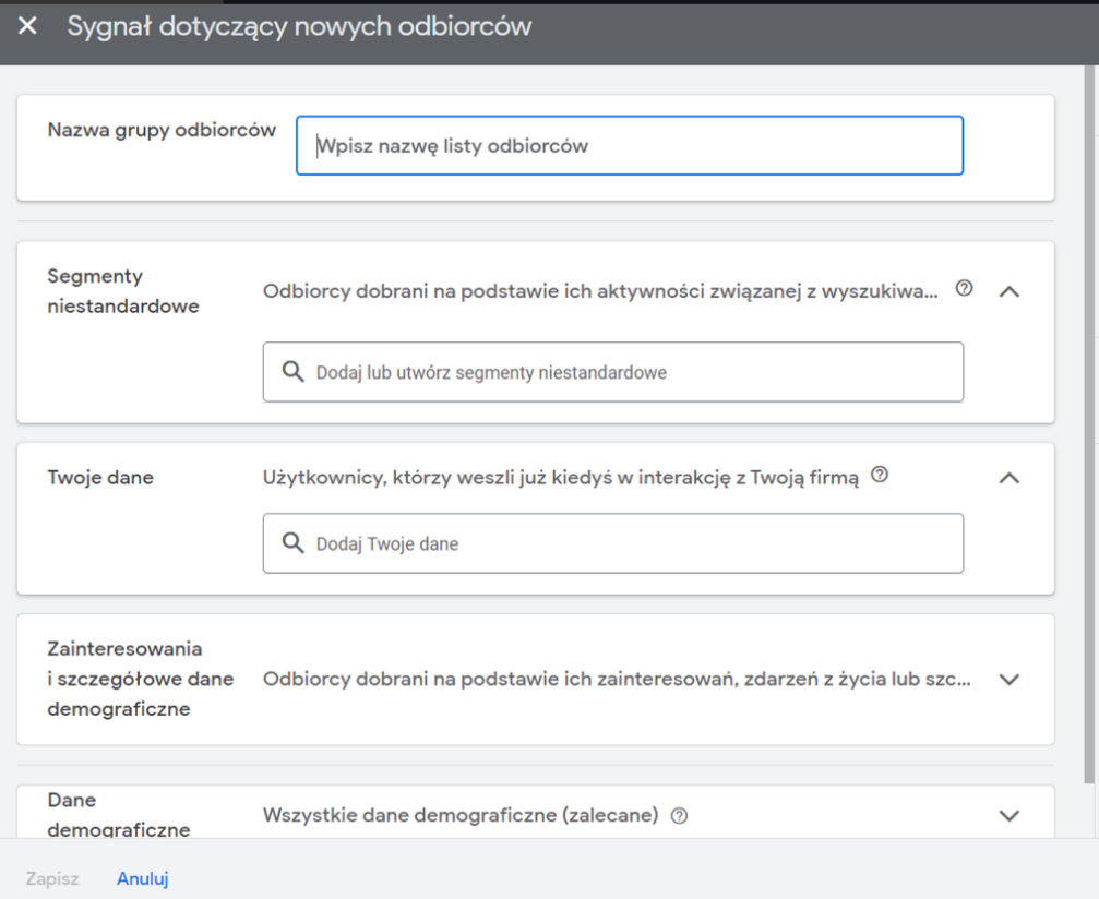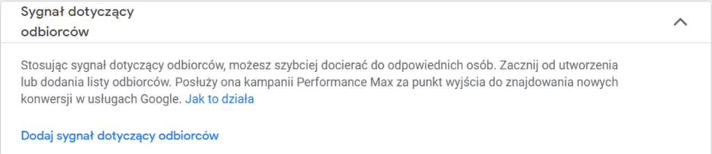 Sygnał dotycząćy odbiorców to nowa opcja, która zagościła w panelu reklamowym wraz z kampaniami Performance Max.