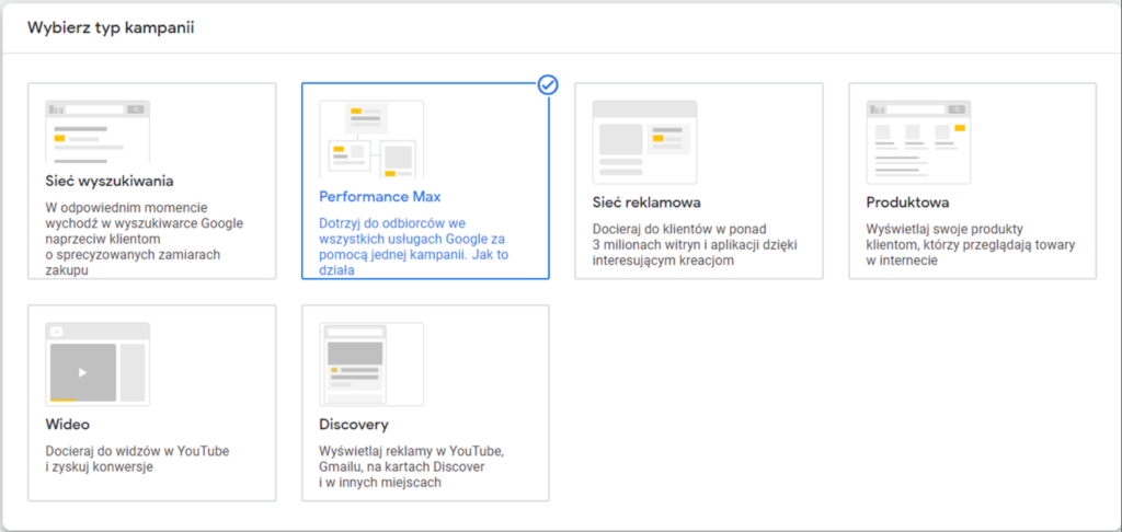 Twoją pierwszą kampanią będzie Performance Max. Będzie to najlepszy wybór, ponieważ:
