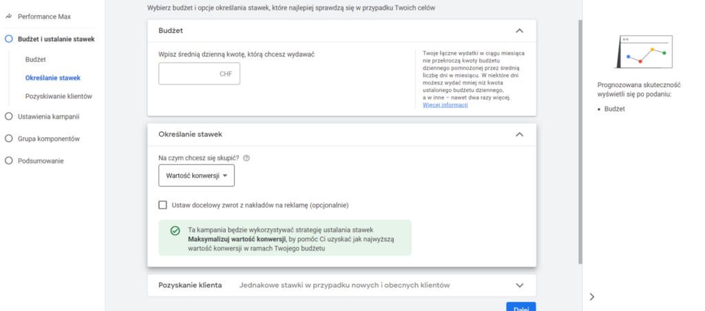 Po prawej stronie zobaczysz też prognozowaną skuteczność kampanii. Z tego co zdążyłem zaobserwować na kontach wynika z tego tyle, że są to jakieś arbitralne liczby które Google zakłada. Nie warto się tym sugerować.