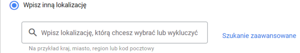 Jeżeli jednak chcesz skupić się na konkretnym mieście, kodzie pocztowym lub nawet ulicy z dużego miasta, to możesz to zrobić wybierając “Wpisz inną lokalizację”